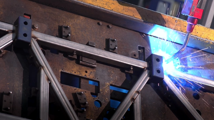 The double E-frame is equipped with a Panasonic TL-2000WG3 arc welding robot and has 4 weld stations. With the use of 4 weld stations a continuous process flow can be created. Each weld stations is equipped with a different welding jig for different production parts. The arc welding robot installation is being used for the welding of components for busses.