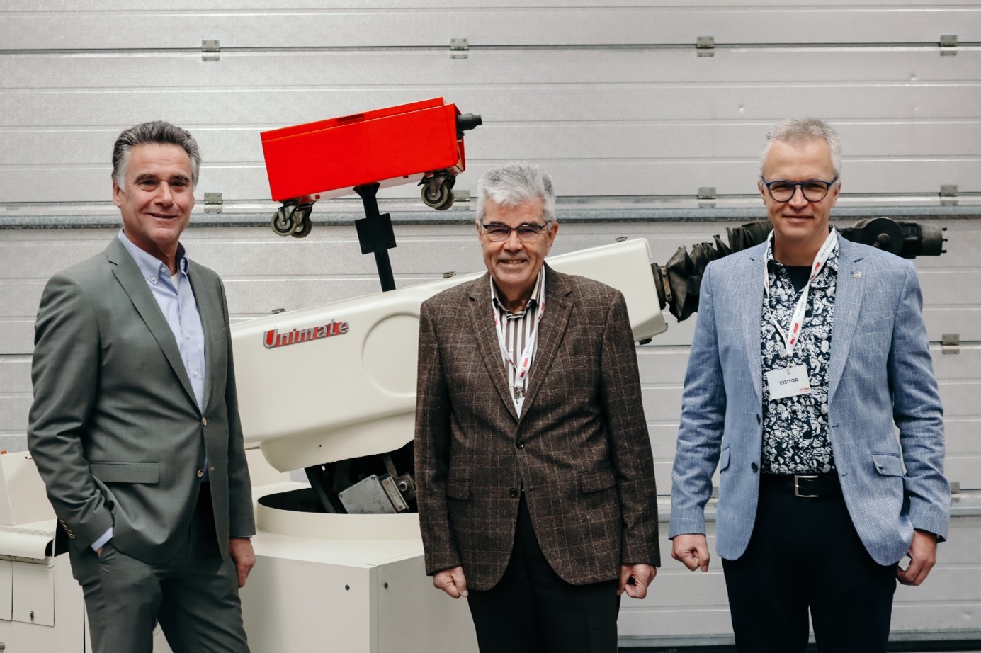 Foto: Remco H. Valk (links), Fons Smits (midden) en Anton Smits (rechts) met de allereerste Valk Welding lasrobot.